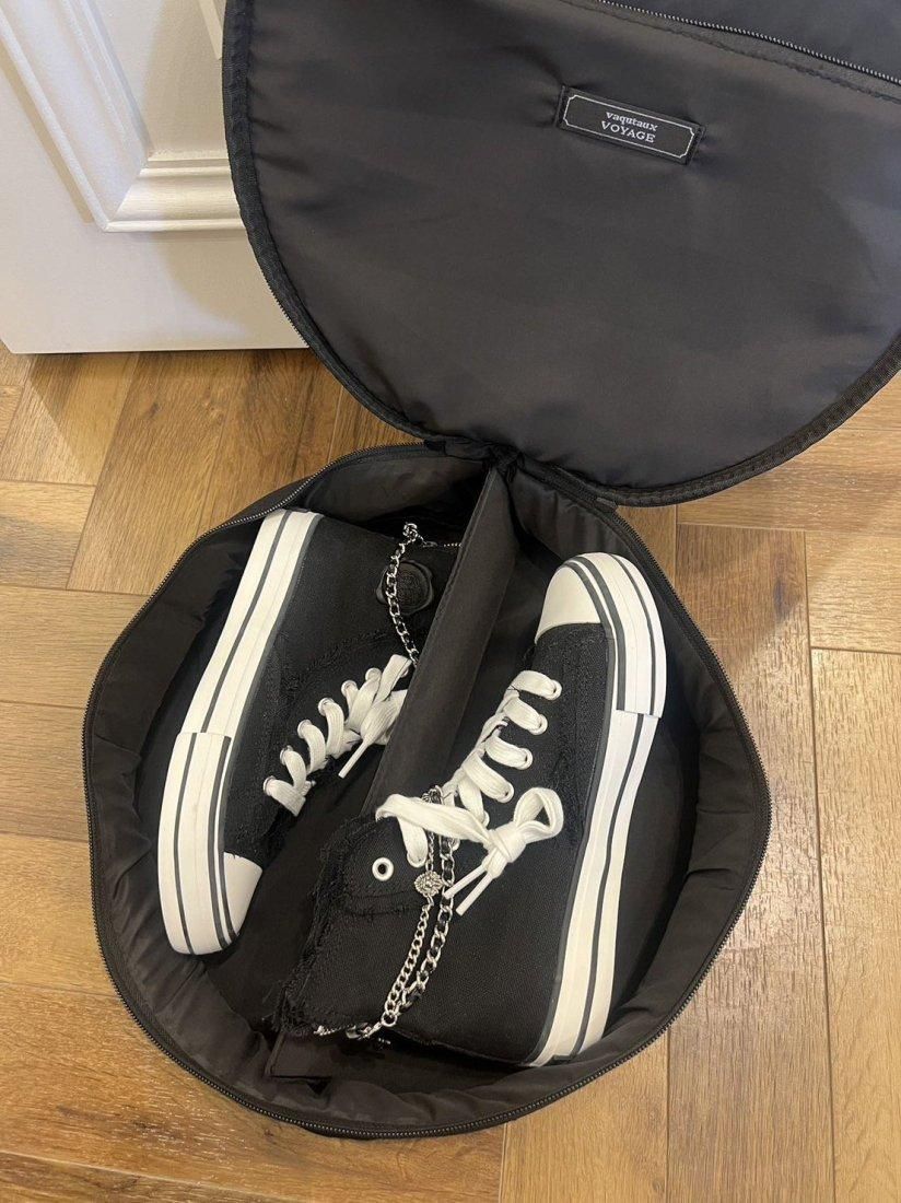 可動式の中敷きが分別してくれるので靴底の汚れが気になりません。また、スニーカー以外にも普段の鞄としてお使い頂けます。内側ファスナー、ダブルジップ、背面にもファスナーポケット合計4個のヴァクトー君をお付けした拘りのお品です。